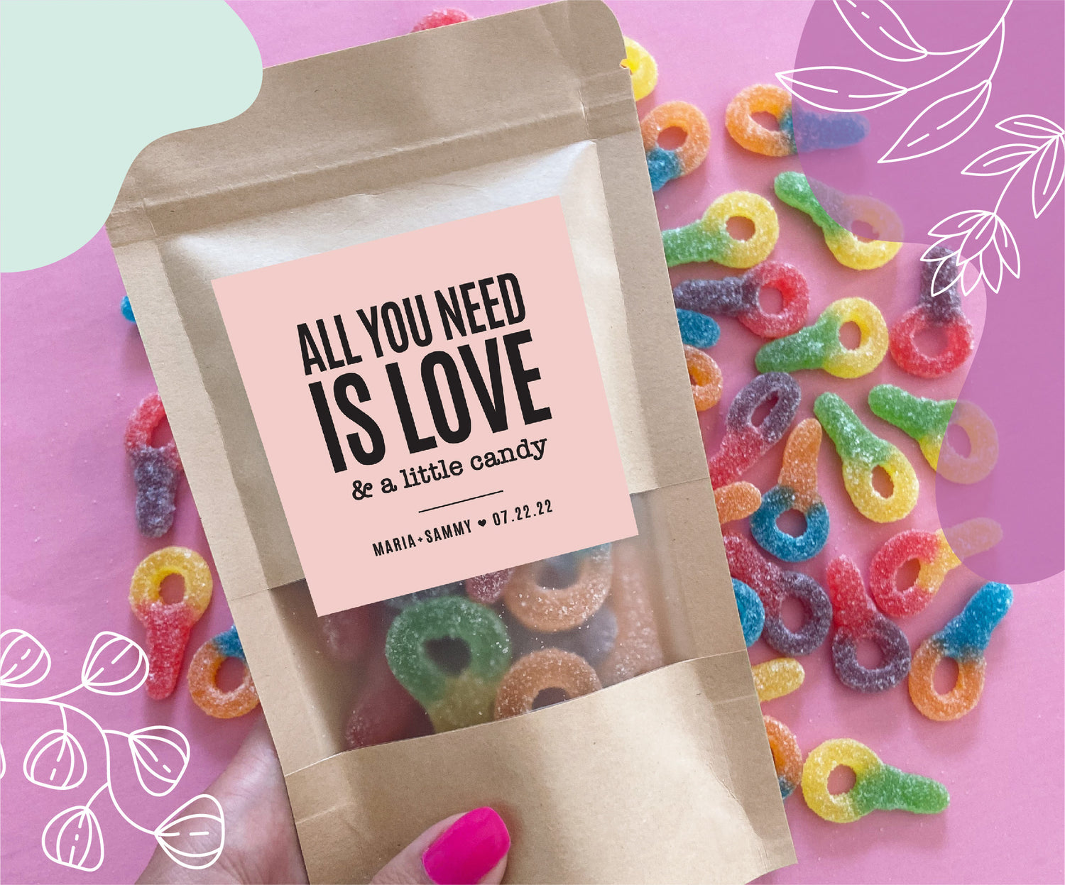 Custom favour bags that are easily fillable with your favourite candy/chocolate!